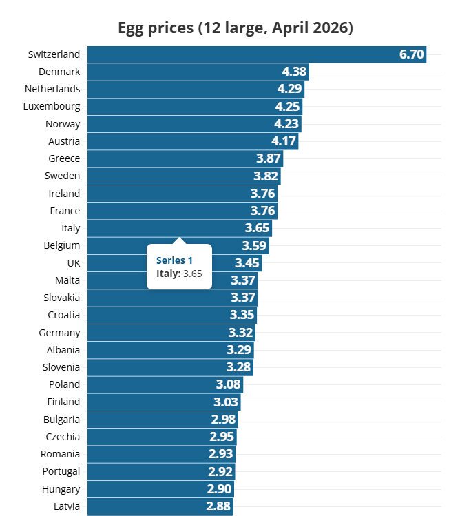 Consumer egg prices vary widely across Europe. According to Numbeo, with data collected in early April 2026, the price of 12 large eggs ranges from €1.52 in Kosovo to €6.7 in Switzerland across 37 European countries.
