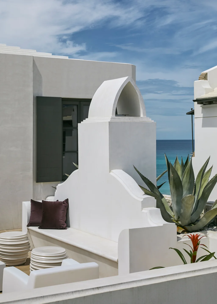 Golden sunlight kisses your bare arms as you stroll through a maze of whitewashed concrete buildings, stark against a bright blue sky. Your sandals tread stone pathways, passing Grecian trellises draped in purple bougainvillea. In the distance is a chalk-white beach with sand soft as sifted sugar and an emerald green sea: a backdrop from Homeric myth. But as you make your way past chic boutiques and pavement restaurants, a Moorish archway pops into view; further down, an Andalusian-style courtyard. Elegant homes are topped with Dutch gabled roofs. There’s not a car in sight, just the tinkling chime of bicycle bells.