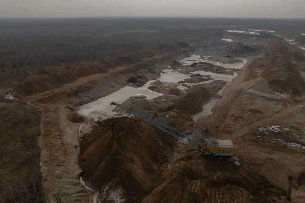 An aerial view shows a dragline excavator operating in an open-pit titanium mine in the Zhytomyr Oblast, on Feb. 28, 2025, amid the Russian invasion of Ukraine. (Roman Pilipey/AFP via Getty Images)